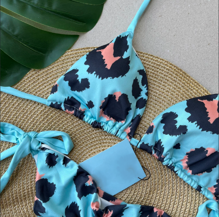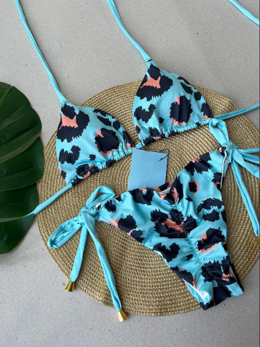 Refresh availabilityThis bikini boasts a triangle design in animal teal and coral print, with removable pads and cheeky scrunch bottoms with side ties. Cheeky thong bottoms offer playful coverage. All pieces are double lined. The fabric is 92% Polyester. A digital sublimation print ensures the color lasting.