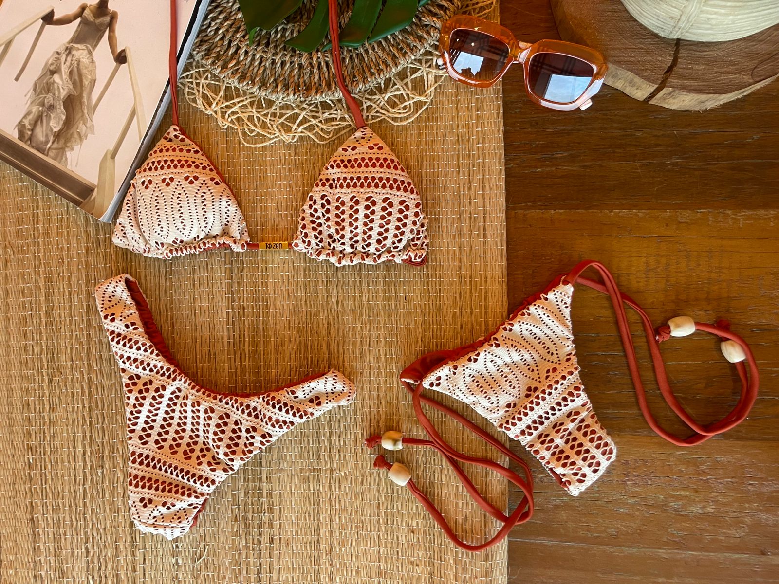Refresh availabilityTwo-in-one bikini set with a twist! Rock the coral & cream hues in this reversible triangle bikini top with pads. And don't forget the fun details - Cheeky threaded Brazilian bottoms with side bead accents.