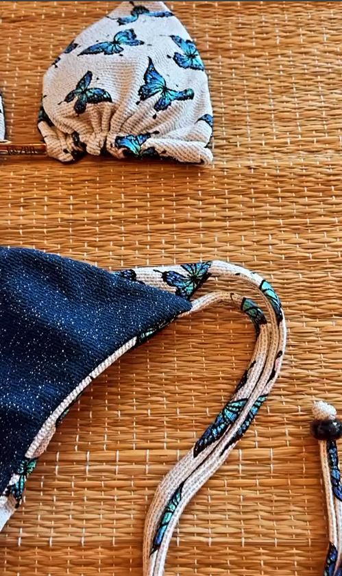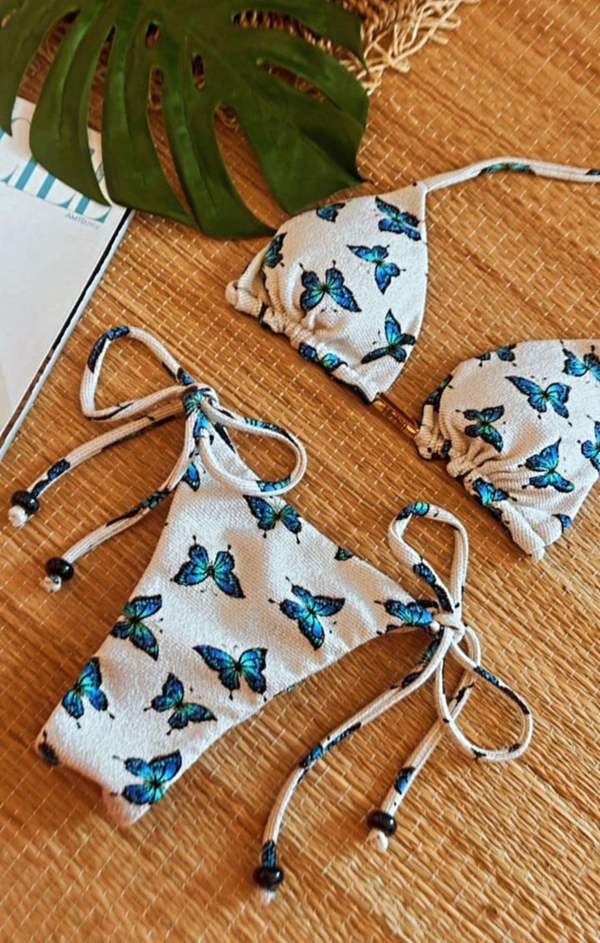Refresh availabilityGet flirty and have fun with this butterfly stamped bikini! The triangle top is adjustable and paired with threaded cheeky thong bottoms, featuring playful side bows and an accent bead. Reversible with blue lurex glitter side, two for one bikini style!