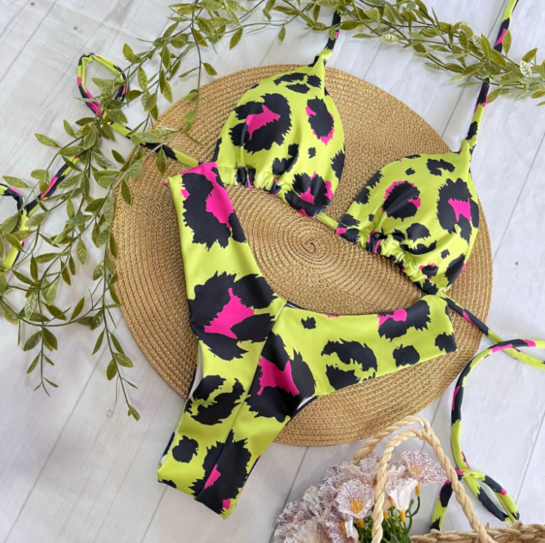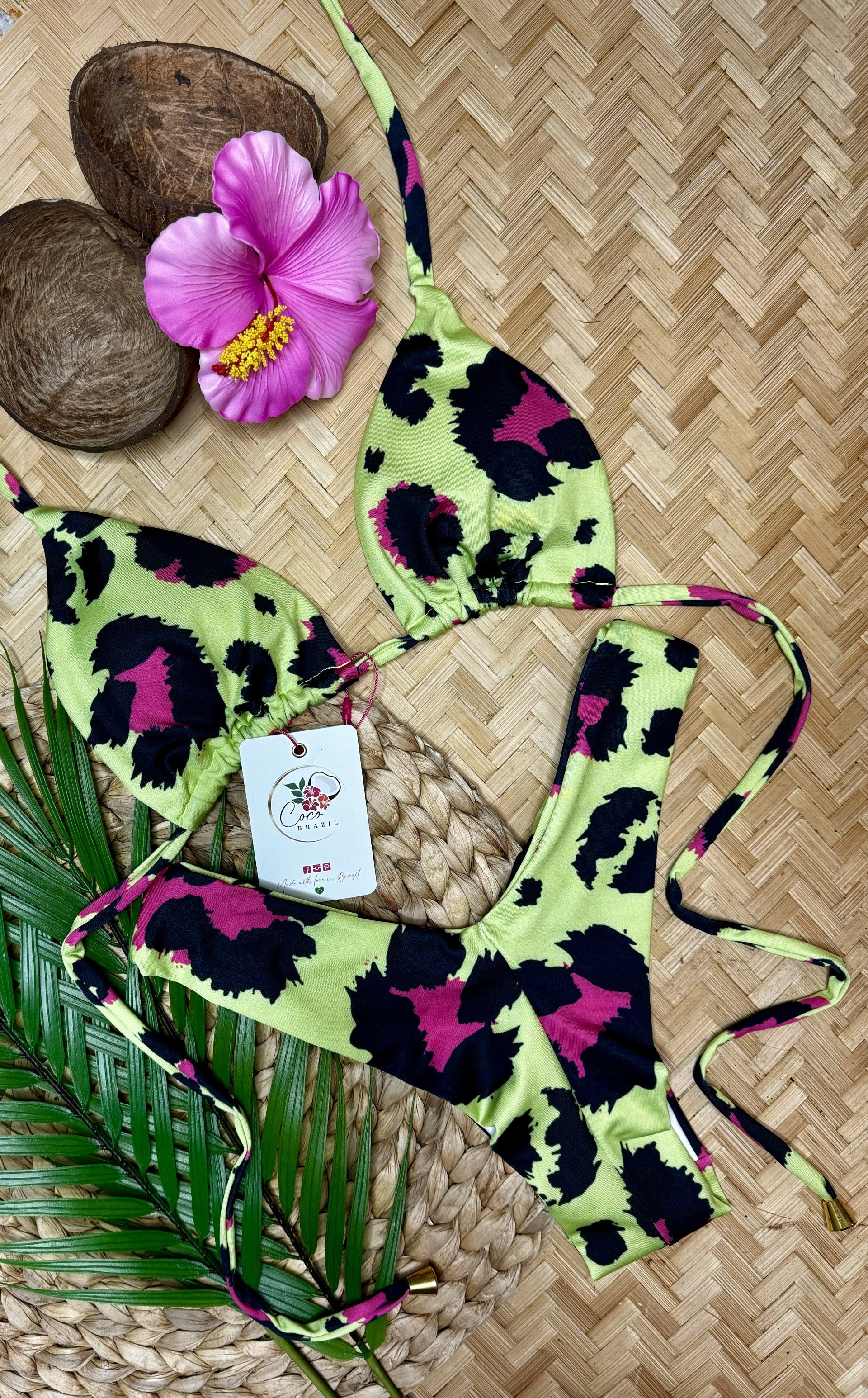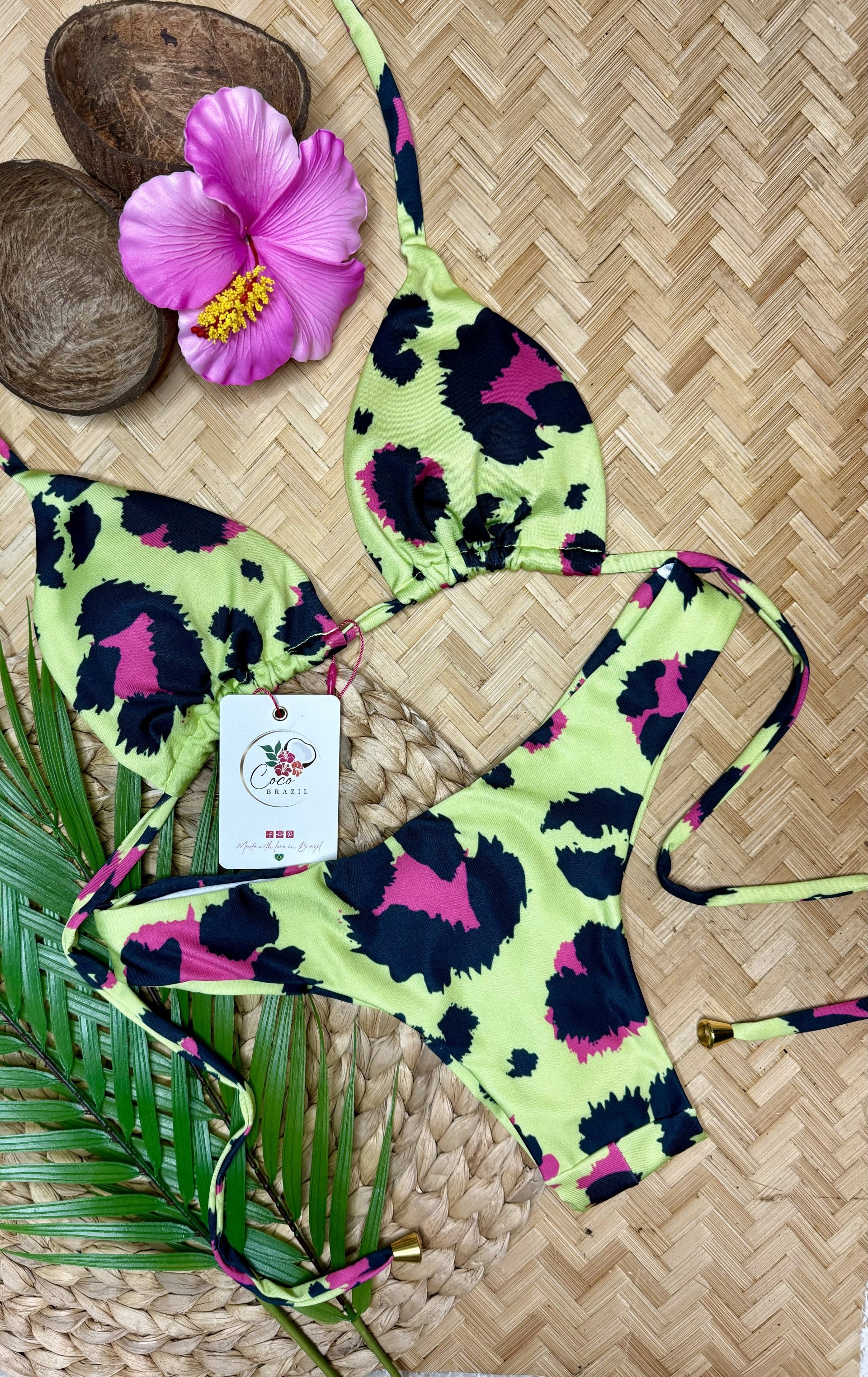 Refresh availabilityGet ready for a wild ride with this green and pink animal print bikini! Featuring a playful triangle bust cut-out and removable pads, as well as cheeky thong bottoms. All pieces are lined for full coverage and the 92% Polyester fabric guarantees vibrant colors that won't fade. It's a print that will last as long as your fun does!