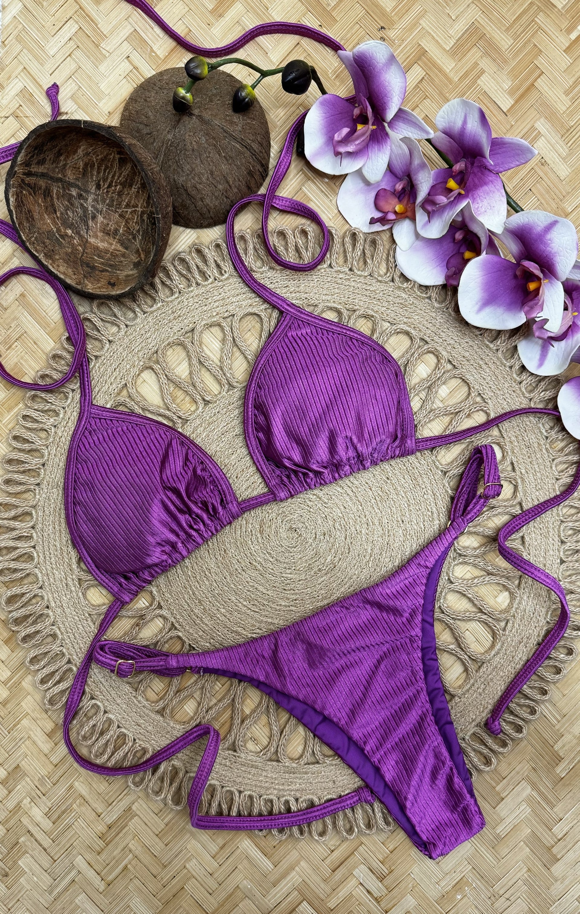 Refresh availabilityGet ready to make a statement in this purple curtain triangle textured top with mini thong bottoms! The adjustable sides add a playful touch to this unique look. Don't be afraid to rock this bold and beautiful ensemble!