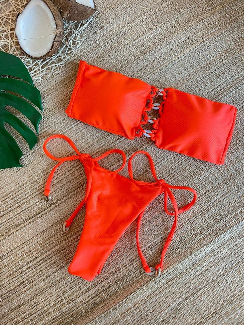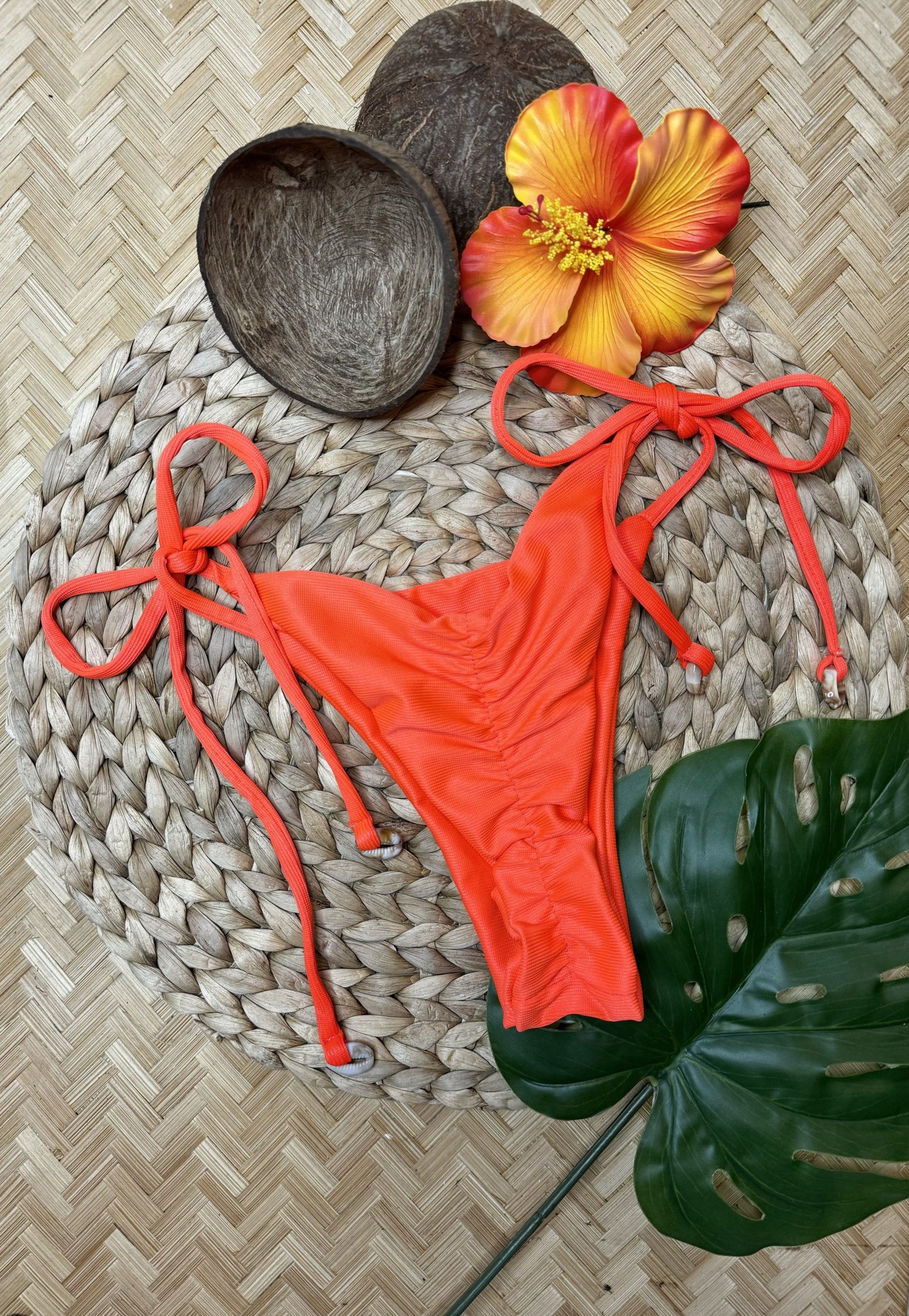 Refresh availabilityThis bandeau bikini brings the heat with its bright orange color and unique puka shell details. The ribbed material adds texture for a beautiful look while the strapless design offers increased coverage. The semi-threaded bow thong bottoms feature a ripple butt lift and can be tied at the hip with shell accents. Talk about a fun and flattering swimsuit!