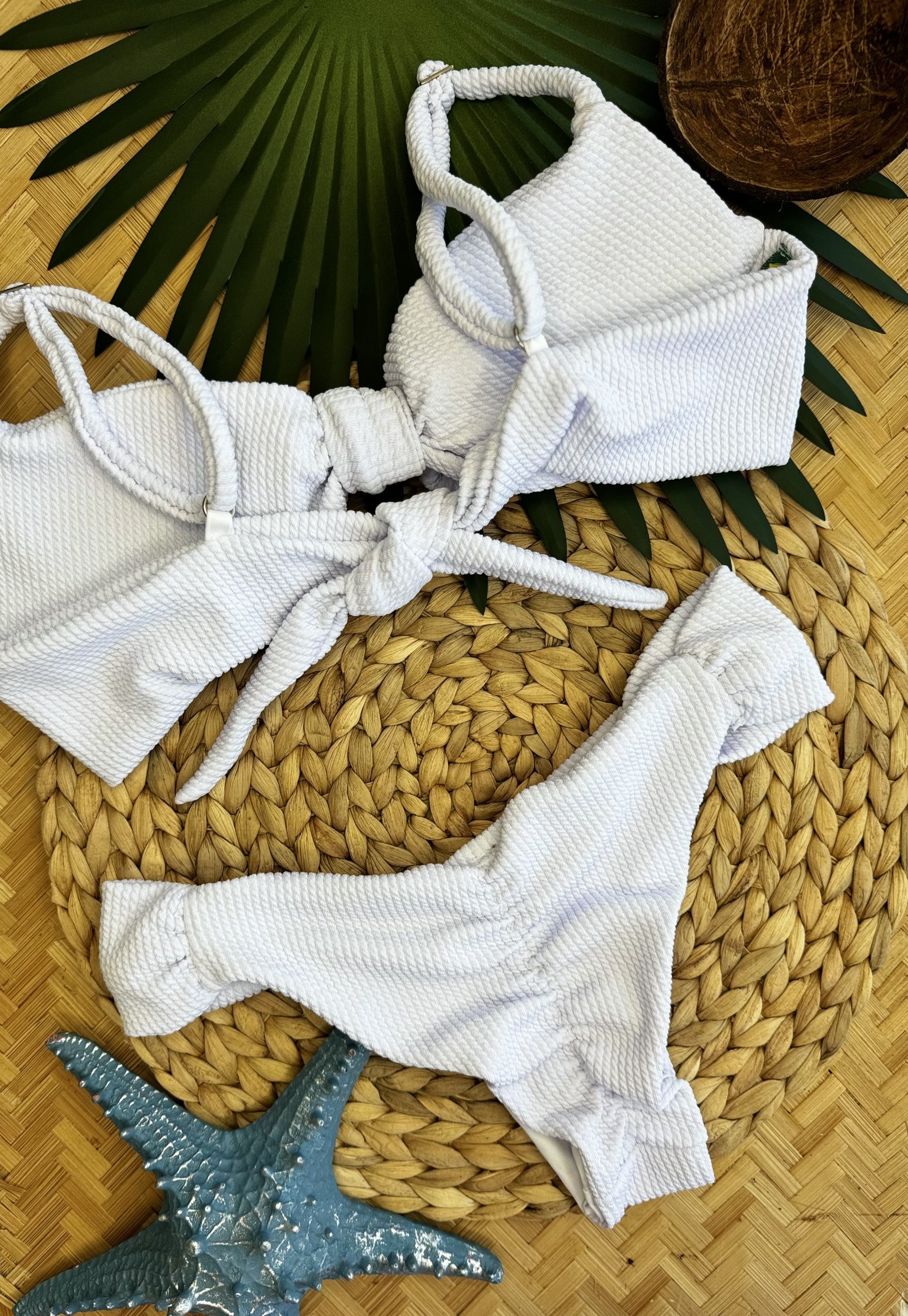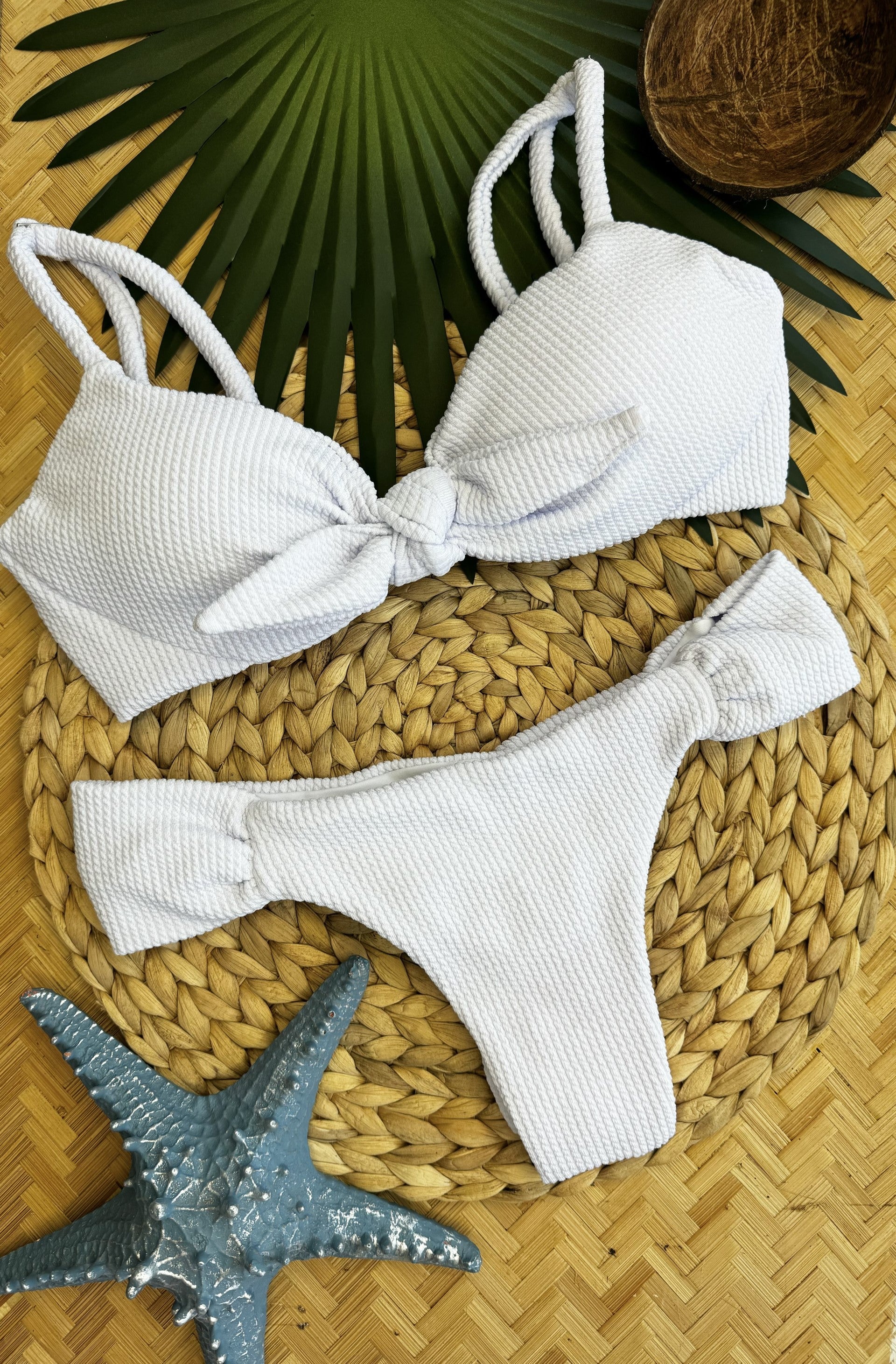 Refresh availabilityFun and flirty textured white bikini with lots of options. Choose your coverage with a secure top and adjustable straps. Add a stylish twist with the front knot that can be removed. Removable bust pads included. Cheeky scrunch bottoms for maximum comfort and a flattering fit. Elevate your look with a touch of class. Double layered for maximum coverage.