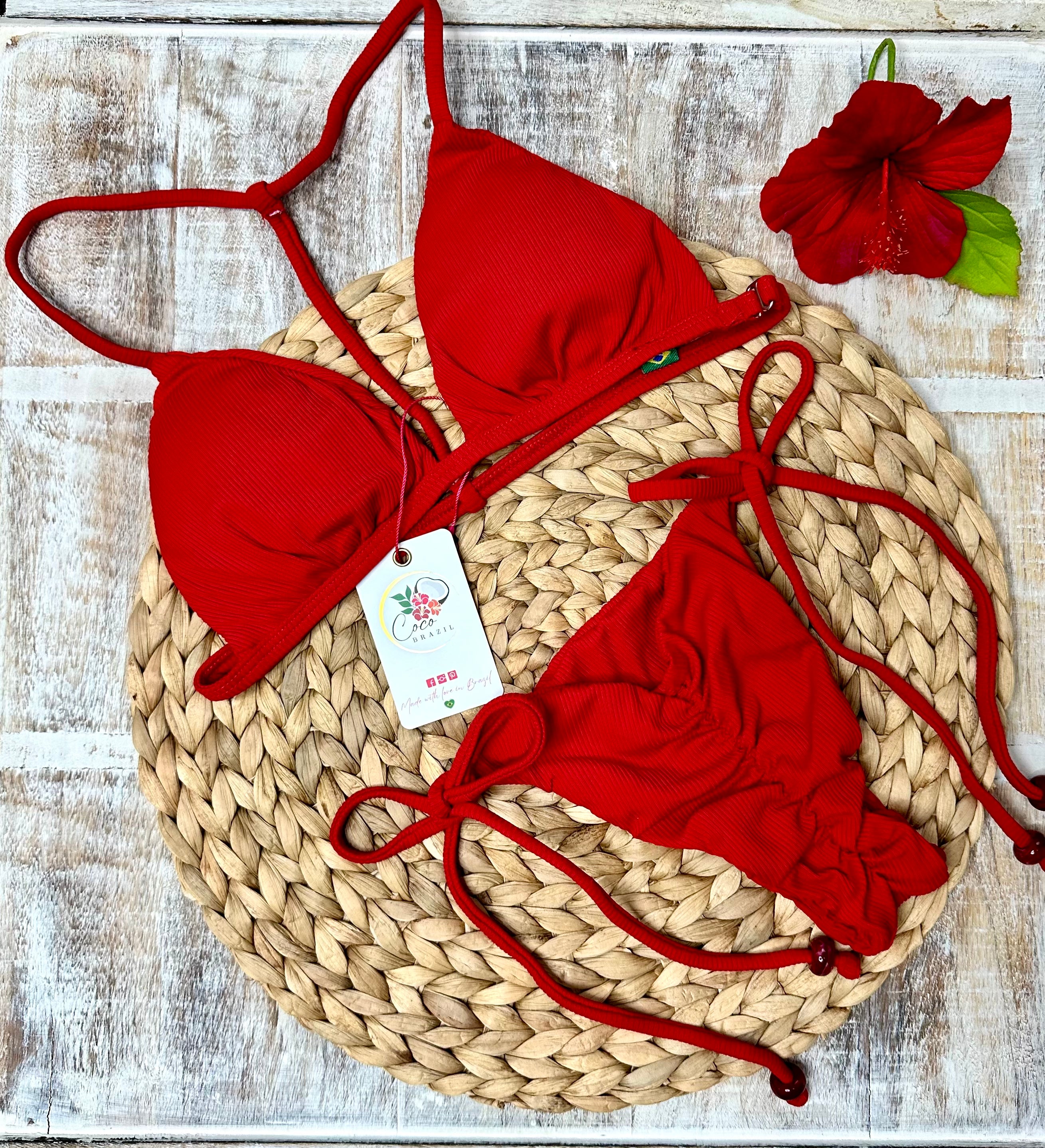 Refresh availability"This set is the bomb in bold red! The T-back top stays put while offering extra support and the option for removable pads. To complete the fun and flirty look, the cheeky scrunch thong bottom has cute side ties and accent beads, all in a one-of-a-kind textured fabric."