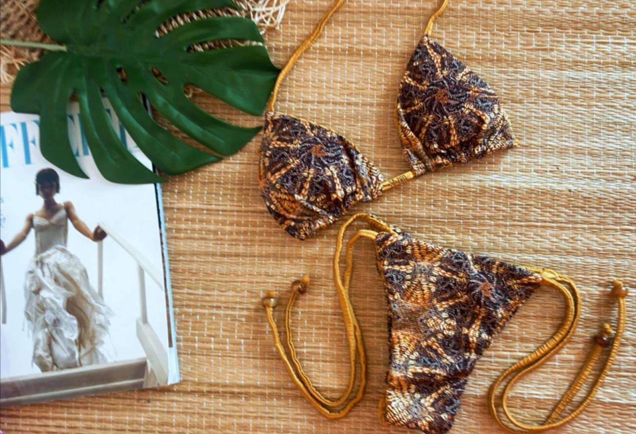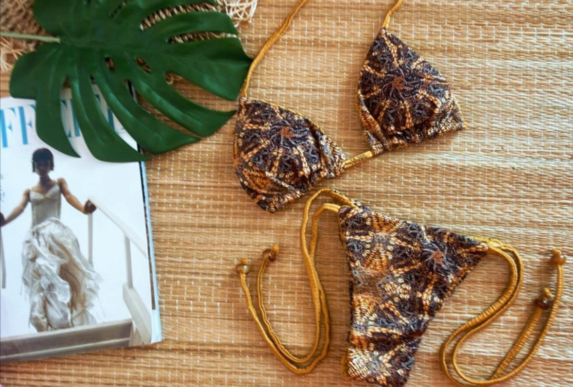 Refresh availabilityDelight in this beautiful rich golden and brown pattern print while also having the option to reverse it for even more style options with a gold textured side! The triangle top is adjustable with removable pads and paired with threaded thong bottoms featuring side ties and a charming accent bead.