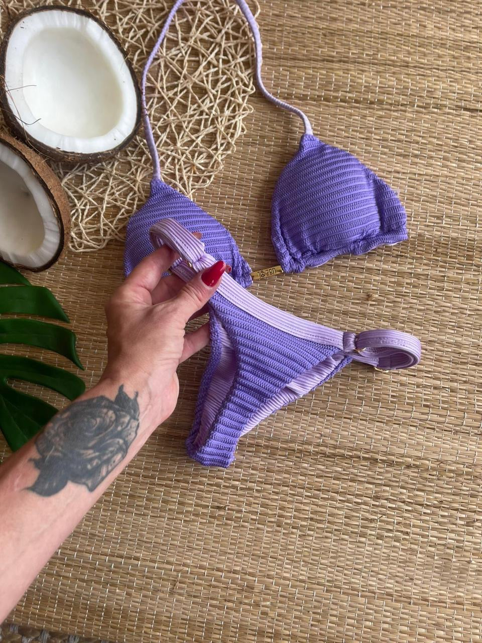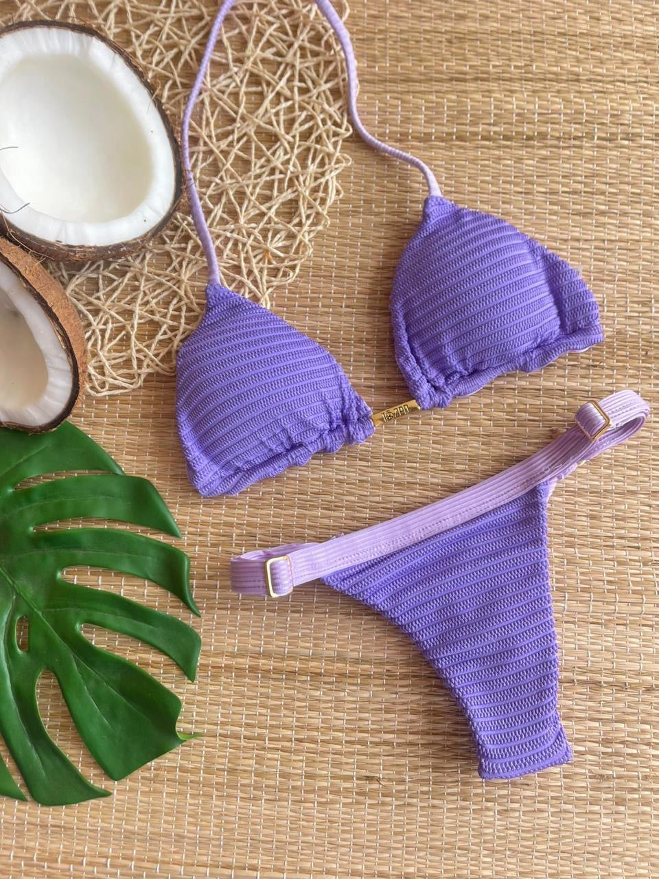 Refresh availabilityStunning lilac color, two-tone purple design, reversible style bikini with a touch of gold at the center. Timeless triangle top, has a detachable pads for extra lightness and perfect sizing. Simple yet stylish micro thong bottoms with adjustable sides.