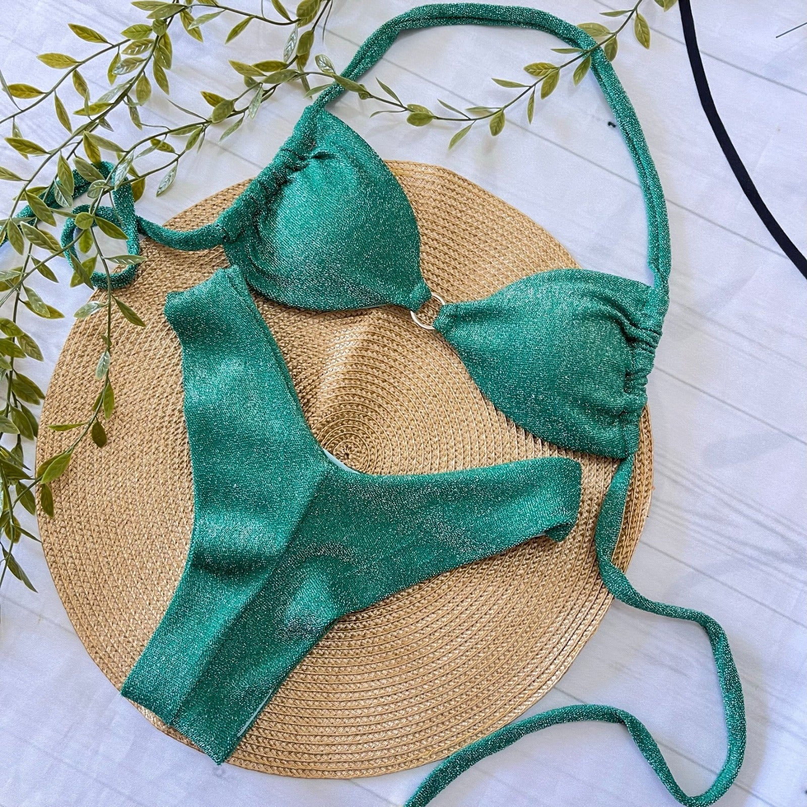 Refresh availabilityStunning shimmering green bikini top with a chic center hoop and cheeky bottom for added style. The cheeky bottoms have a double lined design for no see-through moments. Crafted from 92% Polyester. Bust features removable pads for customizable comfort.