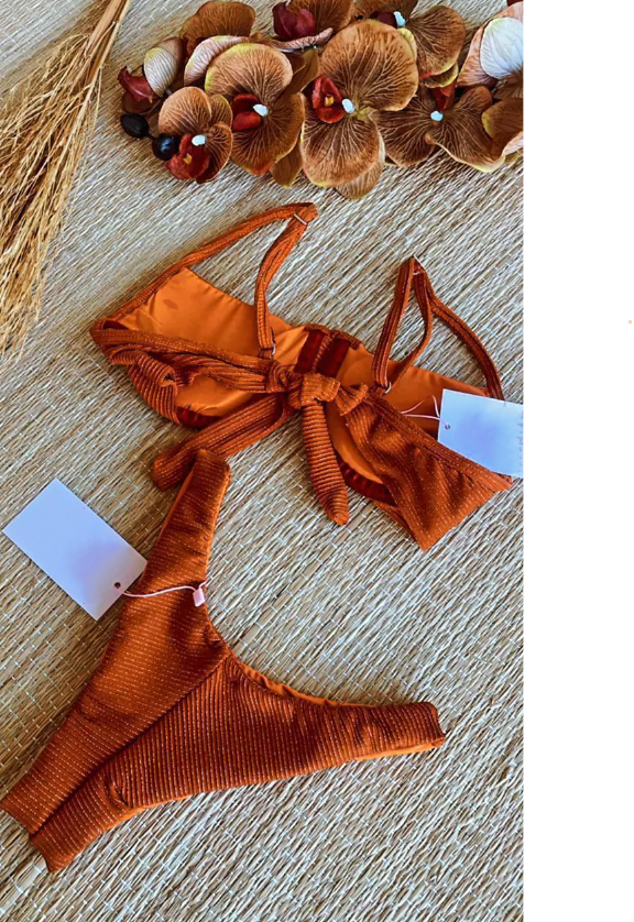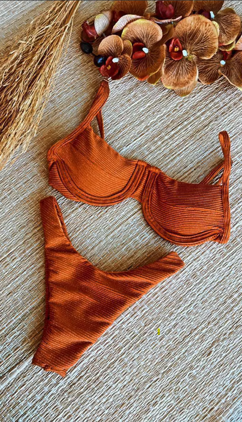 Refresh availabilityDazzling metallic Lurex fabric in a gorgeous terracotta hue! This half cup bikini top features a supportive underwire and adjustable straps, with a cheeky hang glider bottom for a flattering and lifting thong fit. And don't worry, no back seams here! Lycra material ensures ultimate comfort. Set sail in style!