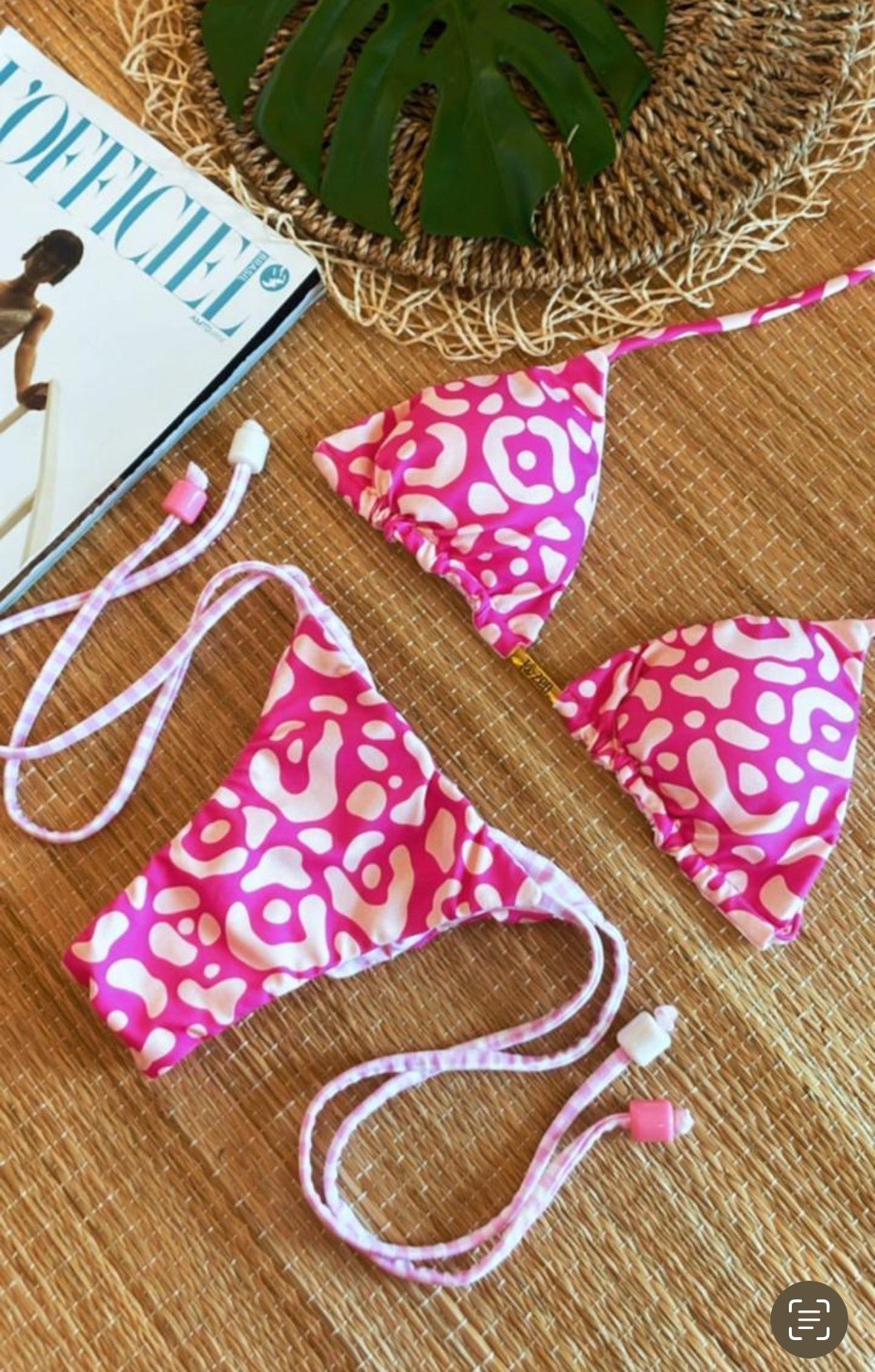 Refresh availabilityGet ready for a double dose of fun with this reversible animal print and pink checkered triangle bikini! The top is adjustable and the bottoms have cute side ties and beads for an extra flair. Plus, you get two looks in one with this 2 for 1 deal!