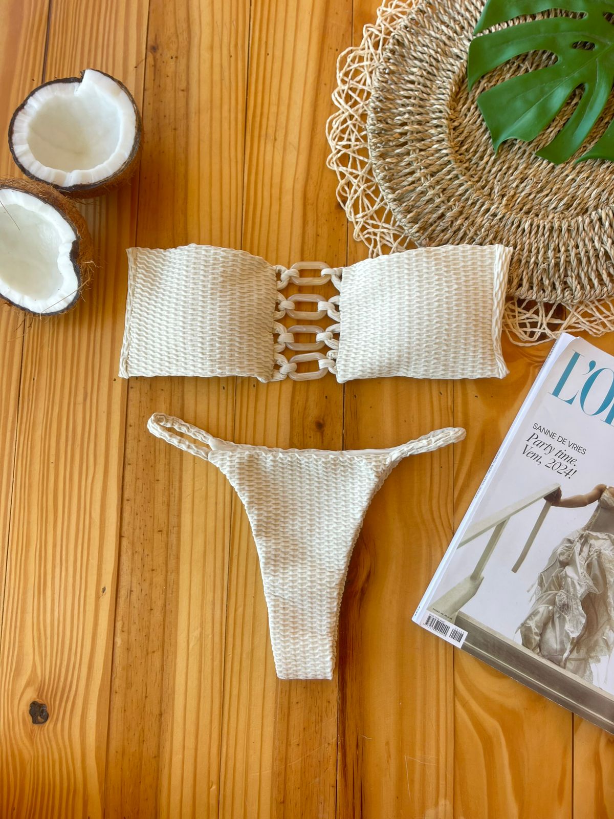 Refresh availabilityThe cream textured fabric is undeniably gorgeous. The back of the bandeau can be adjusted and boasts fun beaded embellishments. Cheeky Brazilian bottoms finish off this look. This playful and flattering design is a must-have for summer! The top has removable pads and each piece is carefully handcrafted with meticulous attention to detail. It's double layered for maximum comfort.