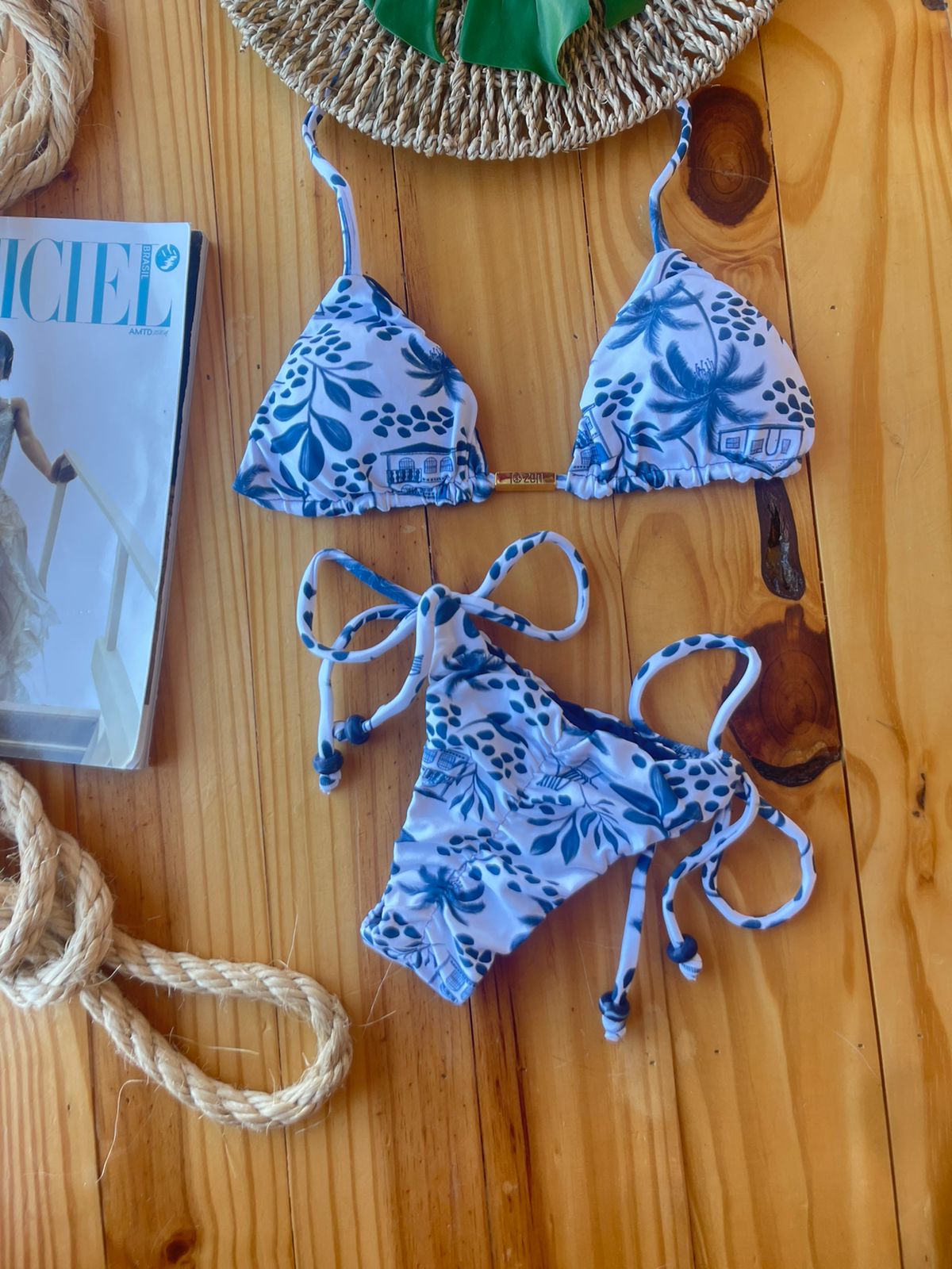 Refresh availabilityGet flirty and have fun with this palm tree stamped bikini! The triangle top is adjustable and reversible to a solid blue side, paired with threaded cheeky bottoms, featuring playful side bows and accent beads.