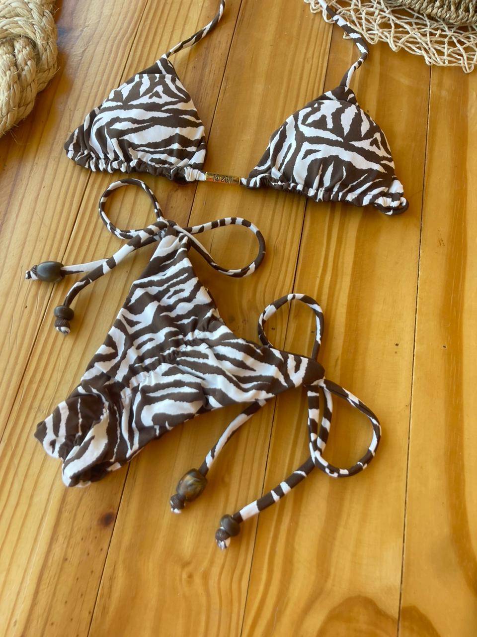 Refresh availabilityFall in love with this stunning zebra cream and brown print, and get double the style with its reversible option! The triangle top features pads, and the cheeky scrunch bottoms come with side ties and adorable accent beads. Plus, the solid cream side adds even more versatility to your beach look!
