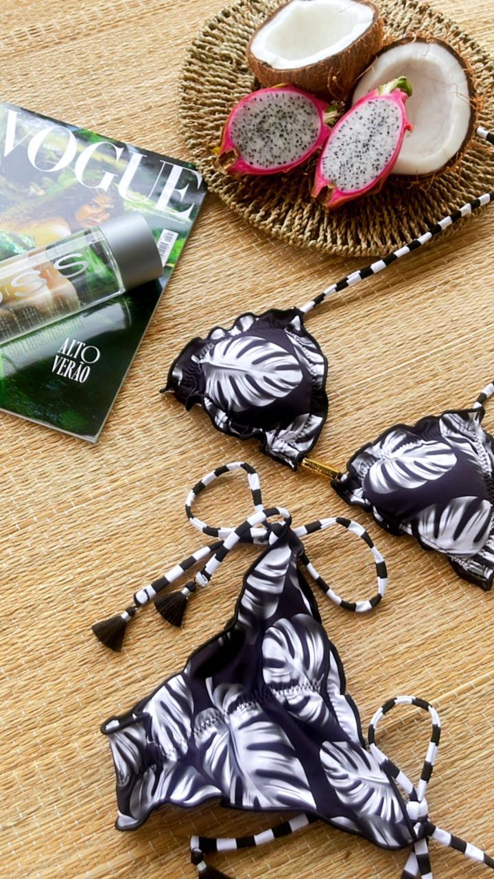 Refresh availabilityExperience the versatile design of our Tropical Monstera Leaf & Stripes Bikini, featuring a reversible traditional triangle bra with elegant, ruffled edges and removeable pads. With a lightweight texture and adjustable straps adorned with gold accents, this bikini offers a perfect fit. The thong-style bottoms also feature ruffled edges and adjustable side ties with beautiful tassel accents for added comfort and a touch of elegance. Discover a truly flattering style with our bikini.