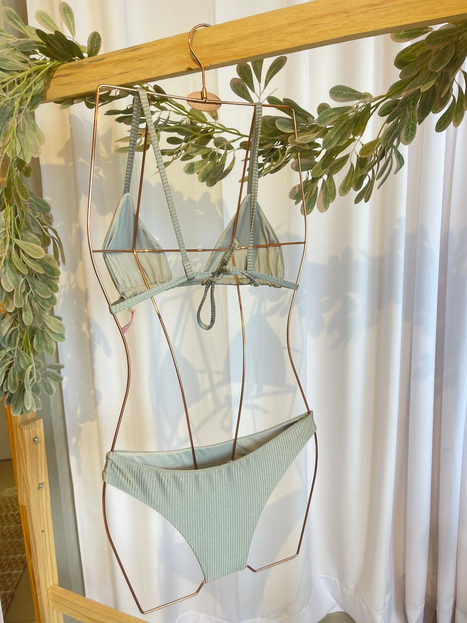 Refresh availabilityThis stunning silver textured bikini is reversible, giving you double the style options. The top can be worn with the straps straight down the back, crossed over (crisscross), or tied at the neck for a playful touch. The classic coverage bottoms provide full coverage and support.
