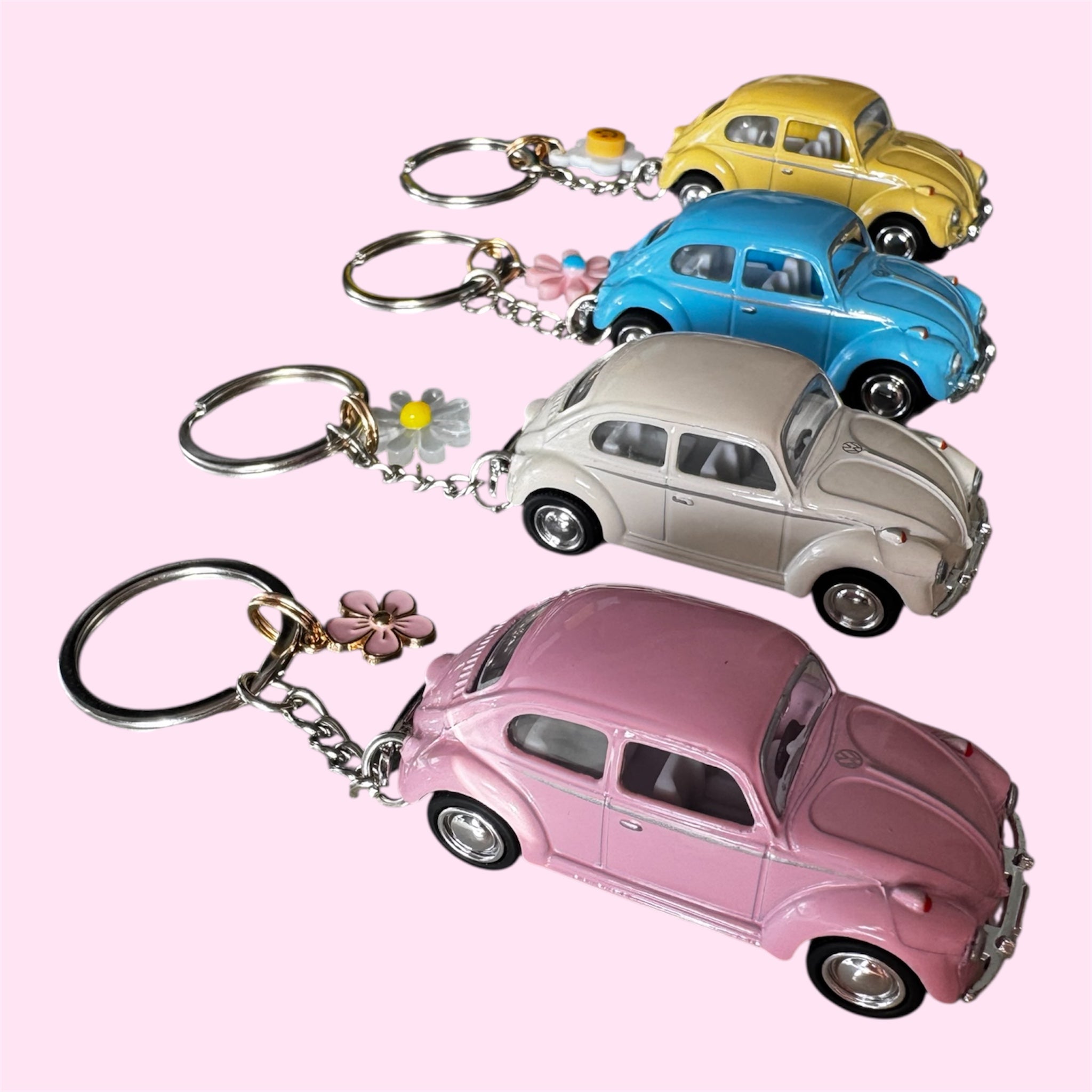 Refresh availabilityAdd a pop of retro charm to your keys, bag, or backpack with this adorable Volkswagen Beetle keychain. Each mini Beetle is finished in soft pastel hues—cream, pink, yellow, or blue—and paired with a playful flower accent charm for a cheerful, vintage vibe.