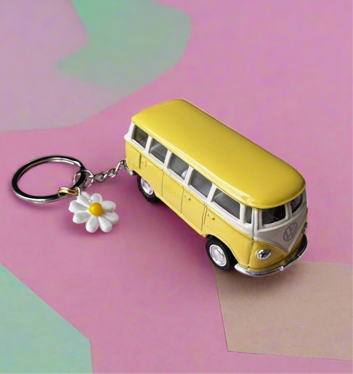 Refresh availabilityCarry a touch of vintage road-trip magic wherever you go. This petite keychain features a detailed mini Volkswagen bus paired with a soft pastel flower pendant for a sweet, nostalgic vibe. Lightweight and durable, it clips easily to your keys, purse, or backpack—adding a pop of color and personality to your everyday essentials. Perfect for VW lovers, free spirits, or anyone who likes a little boho charm on the go.