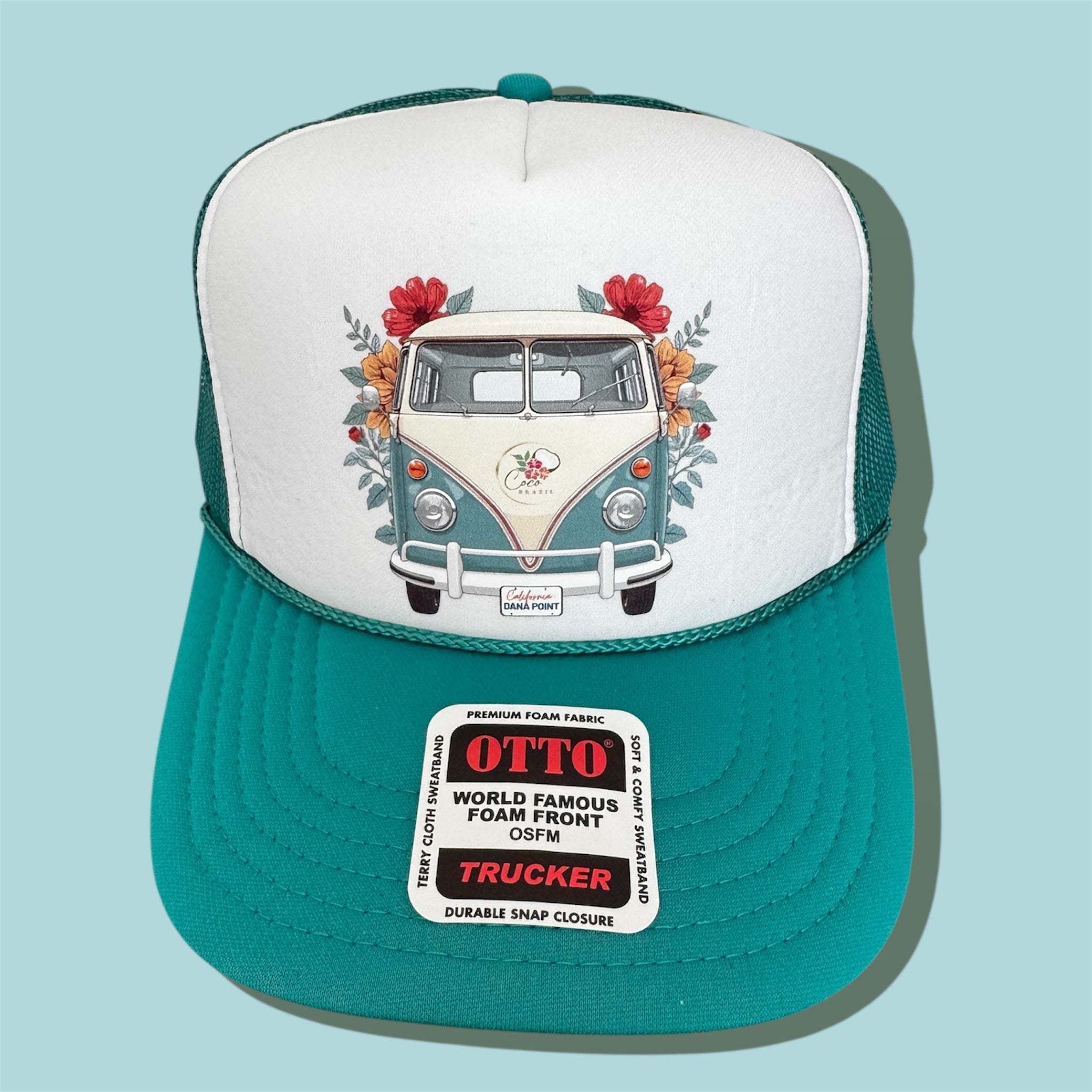 Refresh availabilityBring the beach vibes everywhere you go with this vintage-inspired Otto trucker hat. Featuring a classic teal foam front and mesh back, it showcases a charming Volkswagen bus design surrounded by vibrant tropical blooms—perfect for sunny days and endless adventures.