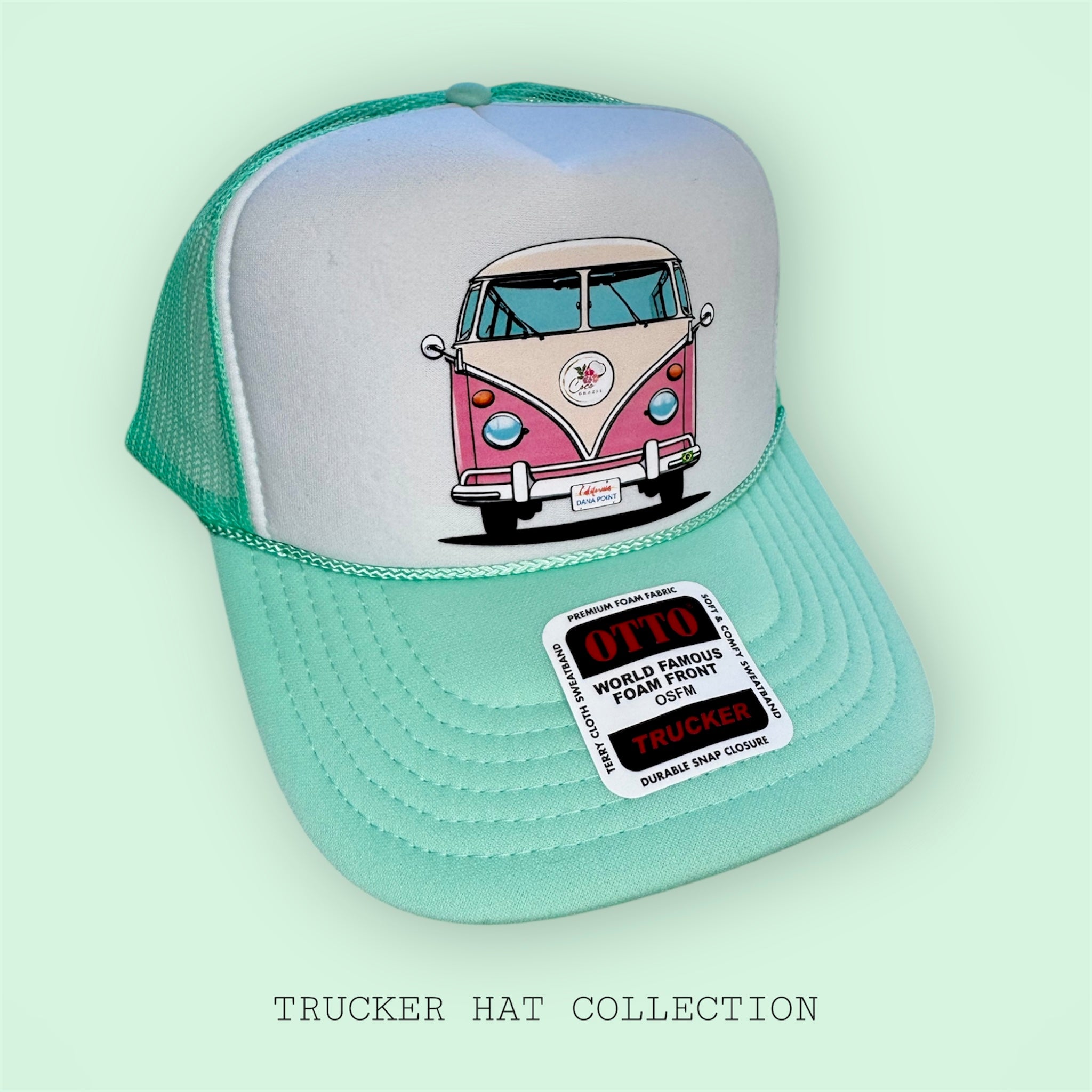 Refresh availabilityBring the beach vibes everywhere you go with this vintage-inspired Otto trucker hat. Featuring a classic mint green foam front and mesh back, it showcases a charming pink Volkswagen bus design with the Coco Brazil logo and Dana Point License Plate—perfect for sunny days and endless adventures.