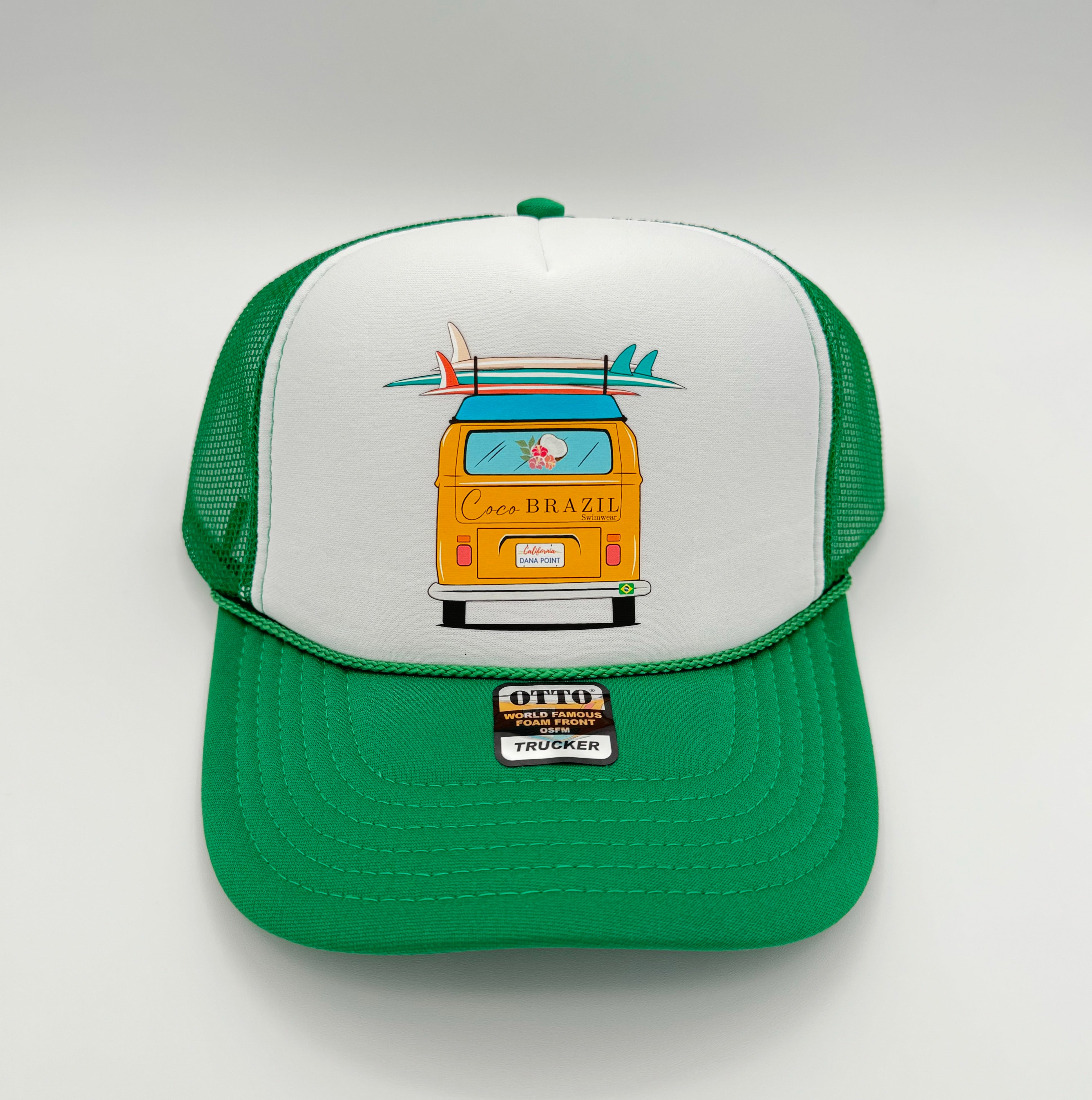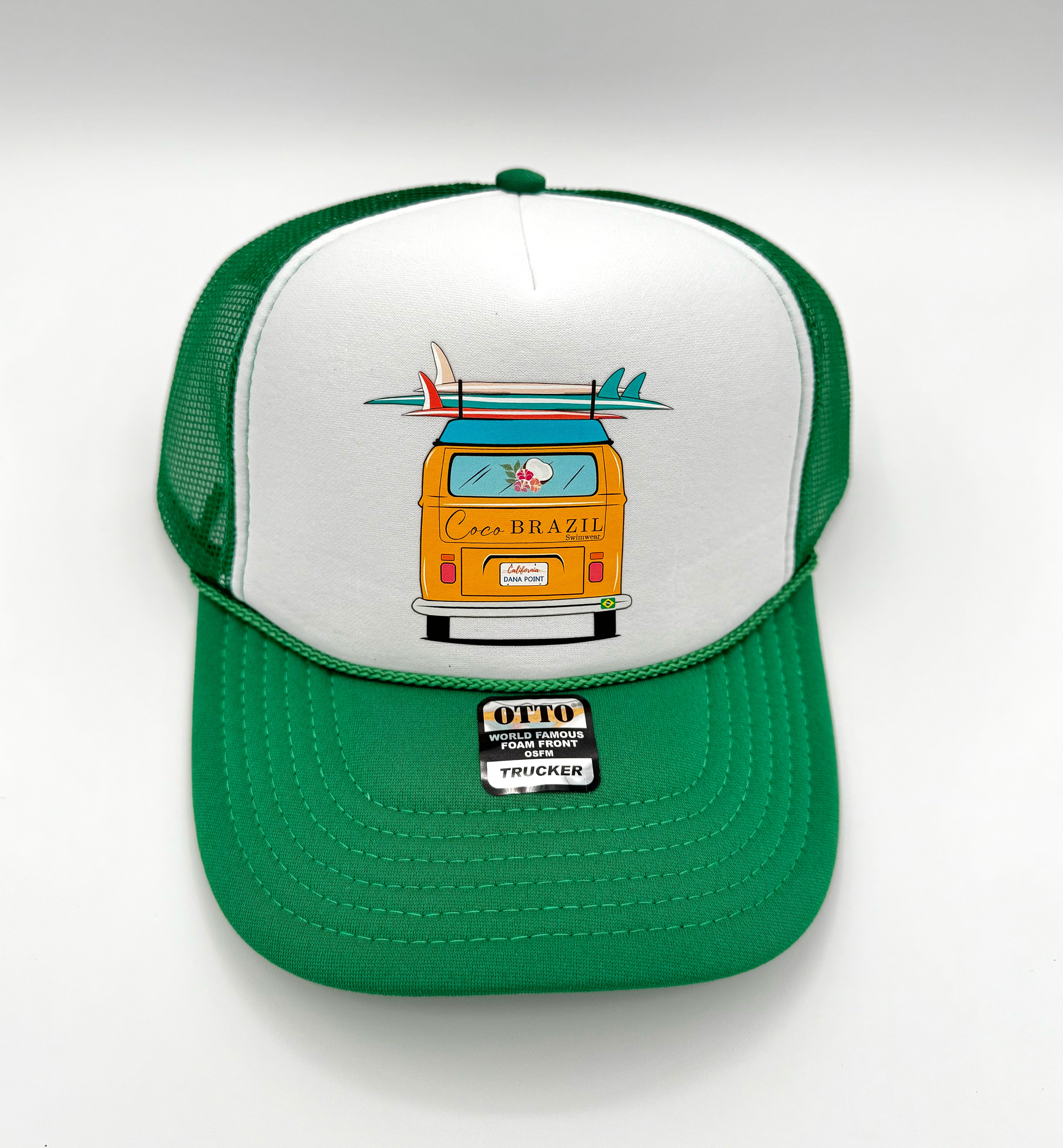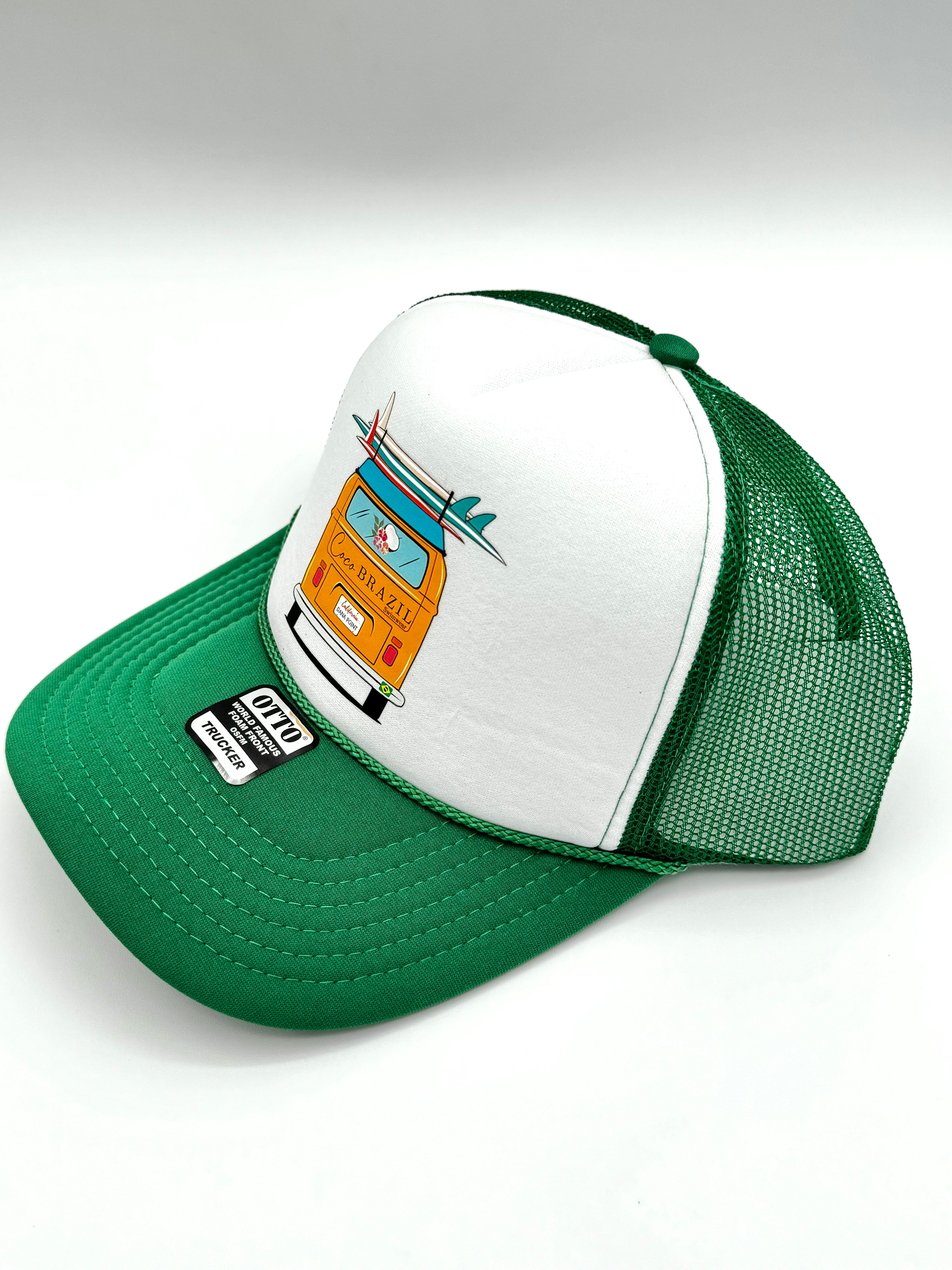 Refresh availabilityThe famous Otto Trucker cap is a playful addition to any wardrobe! With a vibrant two-tone green and white design, this polyester foam front cap features a mesh snap-back and a digital heat transfer Coco Brazil Surf Bus Logo on the front with Brazil flag pin on the side. Whether you're hitting the beach, pool, gym, or just going for a walk, this hat offers sun protection and a sweat band on the inside for comfort and practicality. Grab one before they're gone!